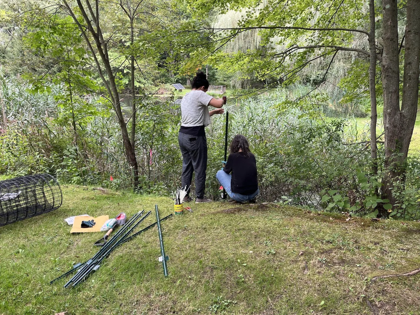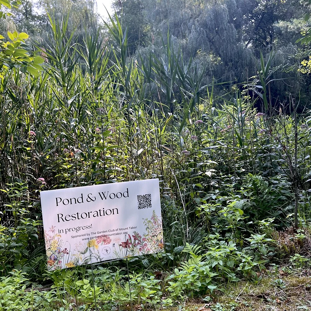 Image of pond slope area with Garden Club x Grow Your Own Forest Project collaboration on site